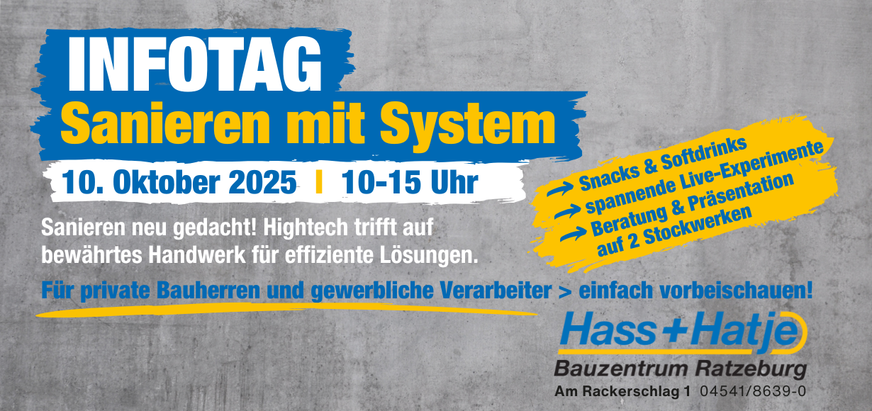 Am 10.10.2025 von 10:00 – 15:00 Uhr lädt Hass+Hatje Bauzentrum Ratzeburg einen Infotag zum Thema Sanieren mit System ein. Dieser […]
