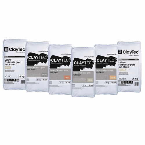 Clay color plaster coarse BRIGHT (ClayTec 10.210), Clay color plaster coarse GRAY (ClayTec 10.220), Clay color plaster coarse RED (ClayTec 10.230), Clay color plaster coarse GREEN (ClayTec 10.240), Clay color plaster coarse YELLOW (ClayTec 10.250), Clay color plaster coarse BEIGE (Clay-Tec 10.260)
