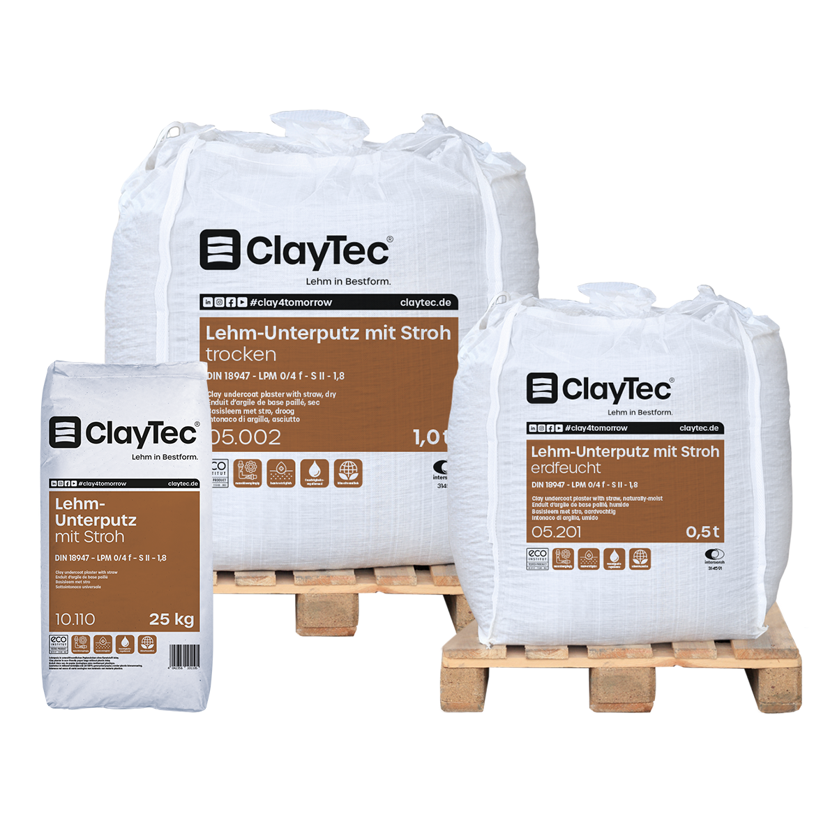 Ein- oder mehrlagiger Unterputz im Innenbereich. Lehm-Unterputz mit Stroh ist seit 30 Jahren der Klassiker für dicke Lagen, z.B. auf unebenem Mauerwerk, für Wandflächenheizungen oder die Denkmalsanierung. Bis 35 mm können in einem Arbeitsgang aufgetragen werden. Das Material ist bestens verarbeitbar, klebt über Kopf, eignet sich zur Schlitzverfüllung und vieles mehr. Lehm-Unterputz mit Stroh ist Grundlage für alle groben und feinen ClayTec Lehmdeckputze.