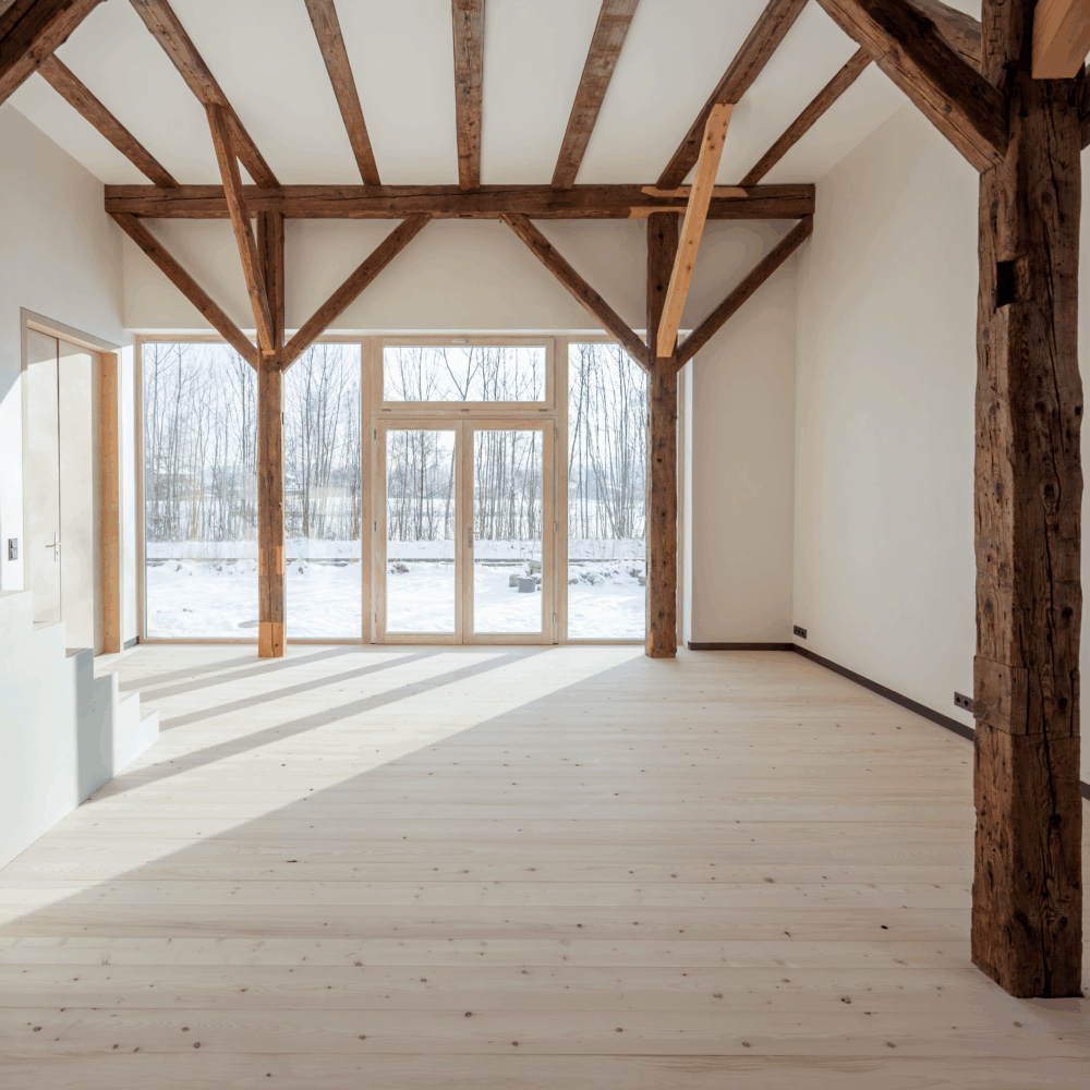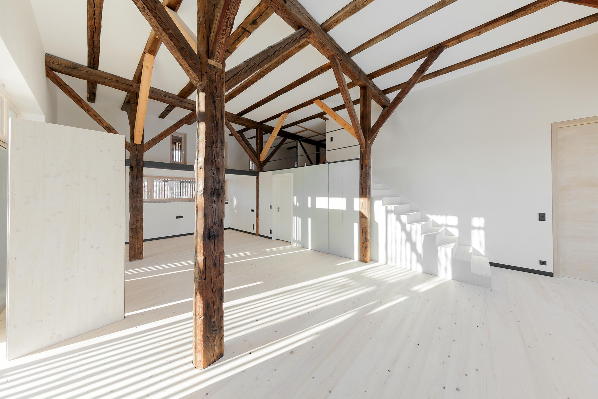 Innen prägen weiße Lehmedelputze und geseifte Tannenholzböden die helle, ruhige Atmosphäre, während das geölte historische Tragwerk aus Stützen, Kopfbändern und Deckenbalken den handwerklichen Ursprung sichtbar lässt. Auch an der Außenfassade konnte Lehmedelputz eingesetzt werden, geschützt durch große Dachüberstände und die Distanz zur historischen Lattenfassade. So entsteht ein sensibles Gleichgewicht zwischen Alt und Neu – zwischen handwerklicher Tradition und moderner Nachhaltigkeit.
